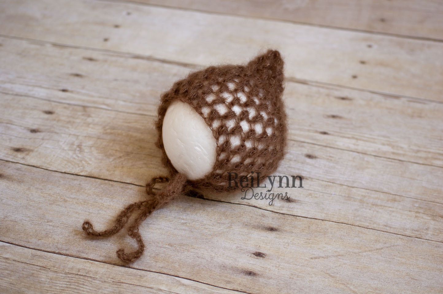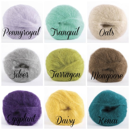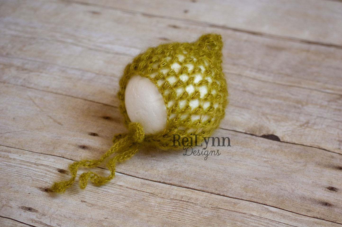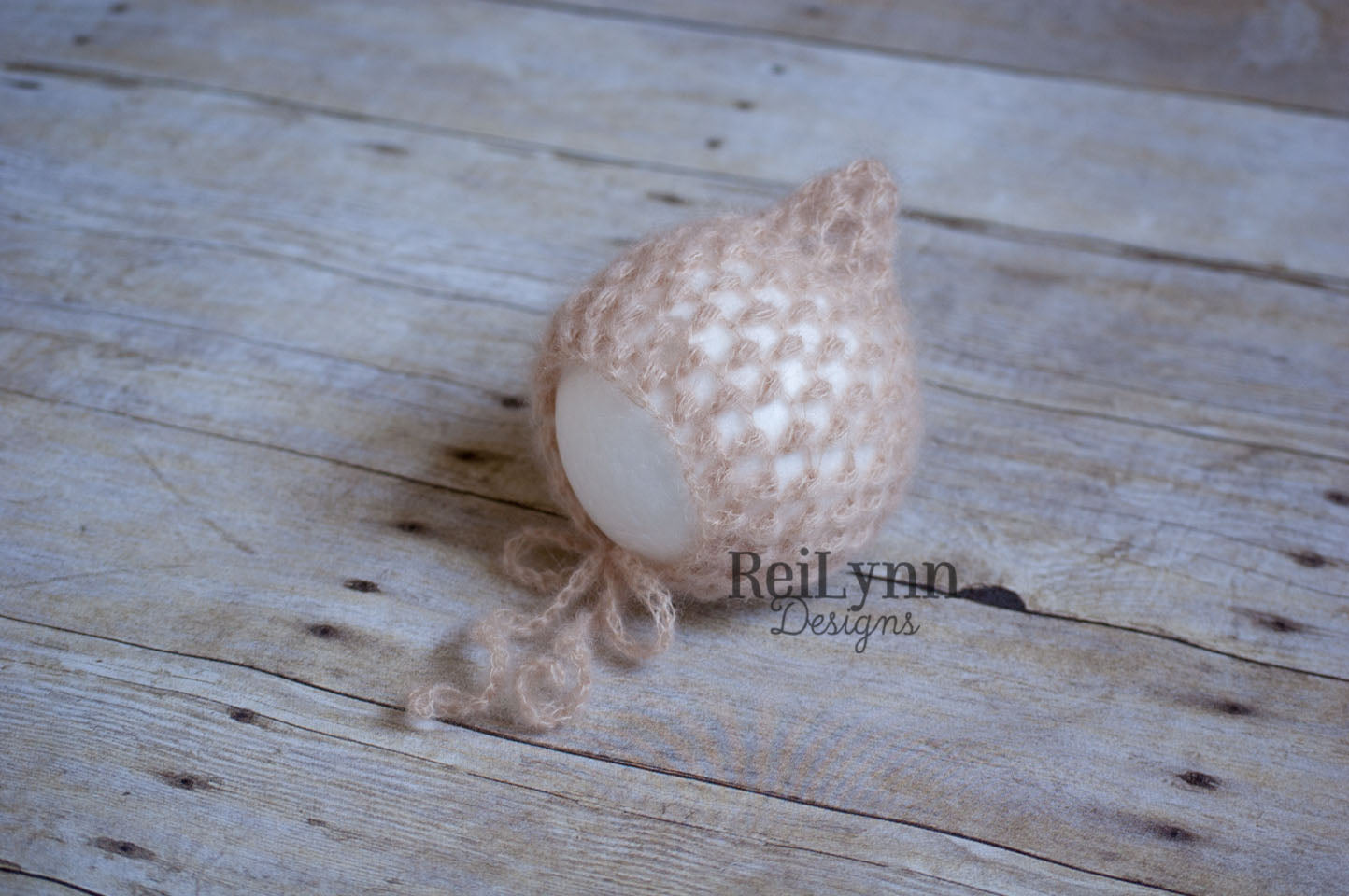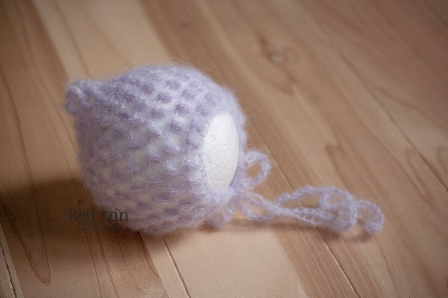 This newborn bonnet features delicate cluster stitches in a soft mohair/silk blend.